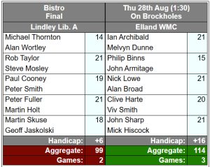After the break Ian Archibald and Melvyn Dunne were successful for Elland 21-14 against Alan Wortley and Michael Thornton and although Peter Fuller and Martin Holt claimed Lindley’s second win with a 21-20 success over Clive Harte and Viv Smith the Bistro trophy was destined for the WMC.