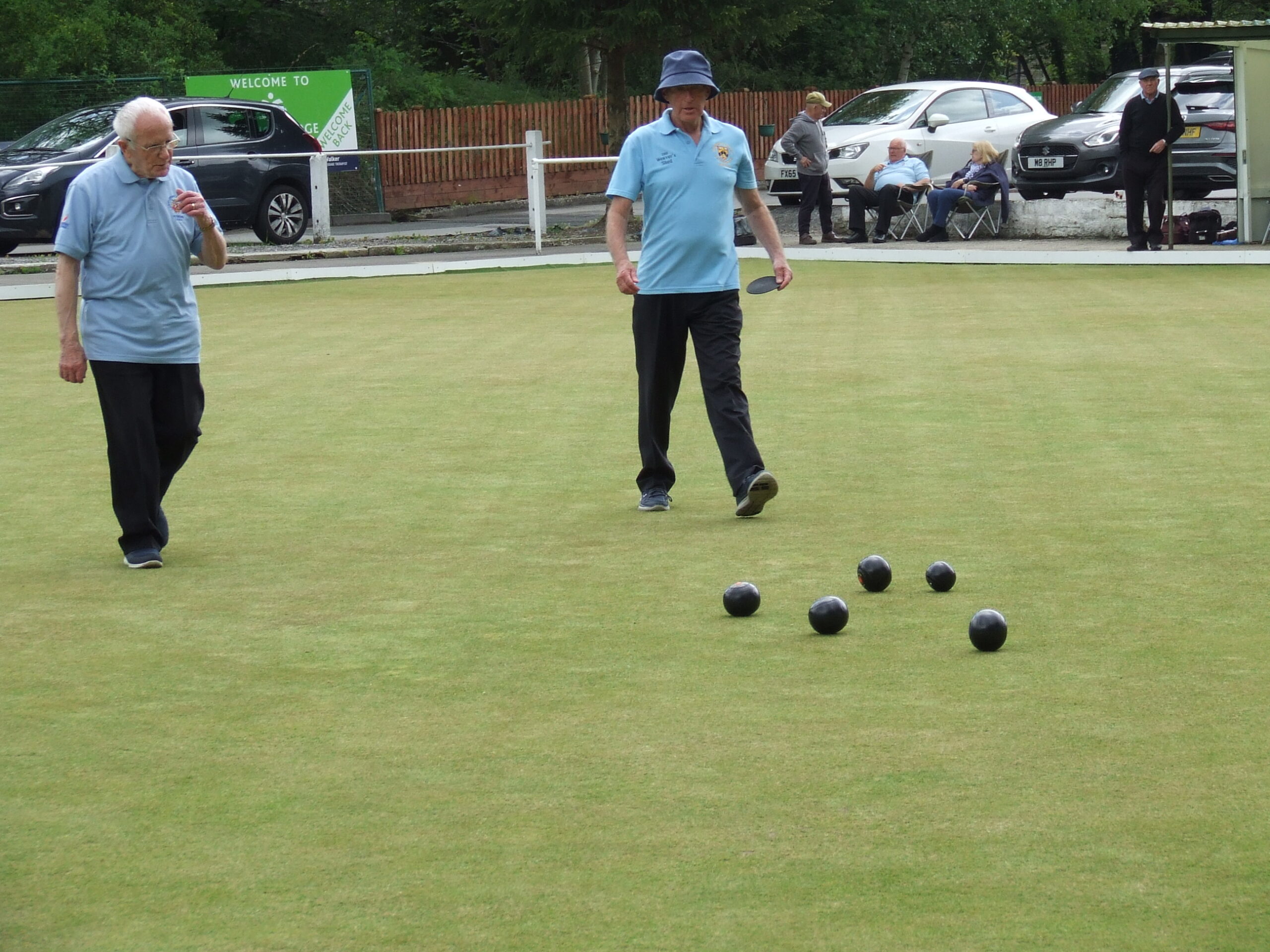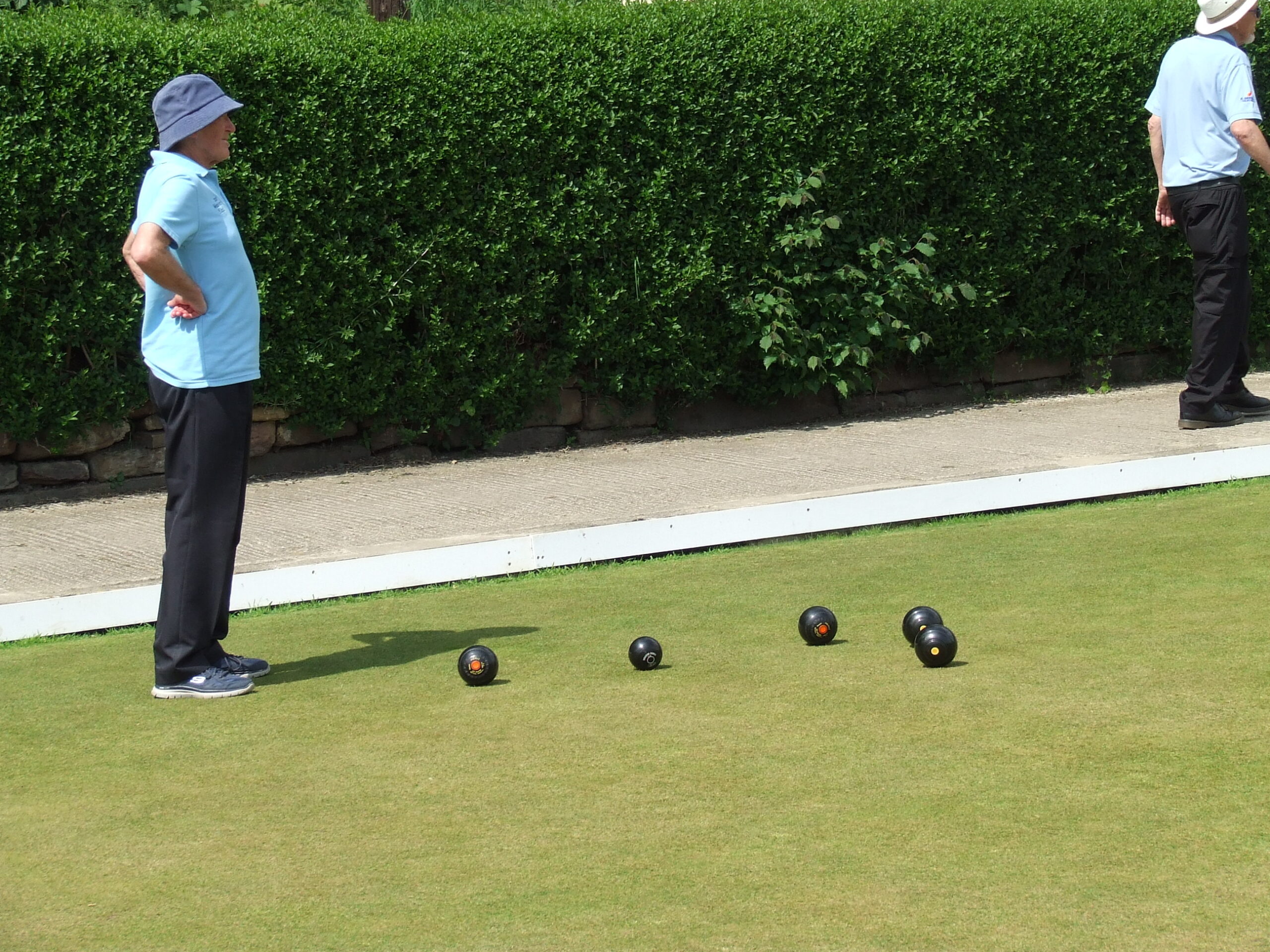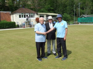 Photo shows Peter Kain who played number 1 with his opponent John Lynch and the referee Ray Tunnacliffe at the start of the game. John Lynch got off to a good start and was 10 – 3 up after 10 ends then Peter pulled it back and got in front 16 – 12 after 20 ends then a great bowl from John won the Jack and from there led well giving Peter no room and won 20 – 18. No disgrace for Peter but John was a worthy winner