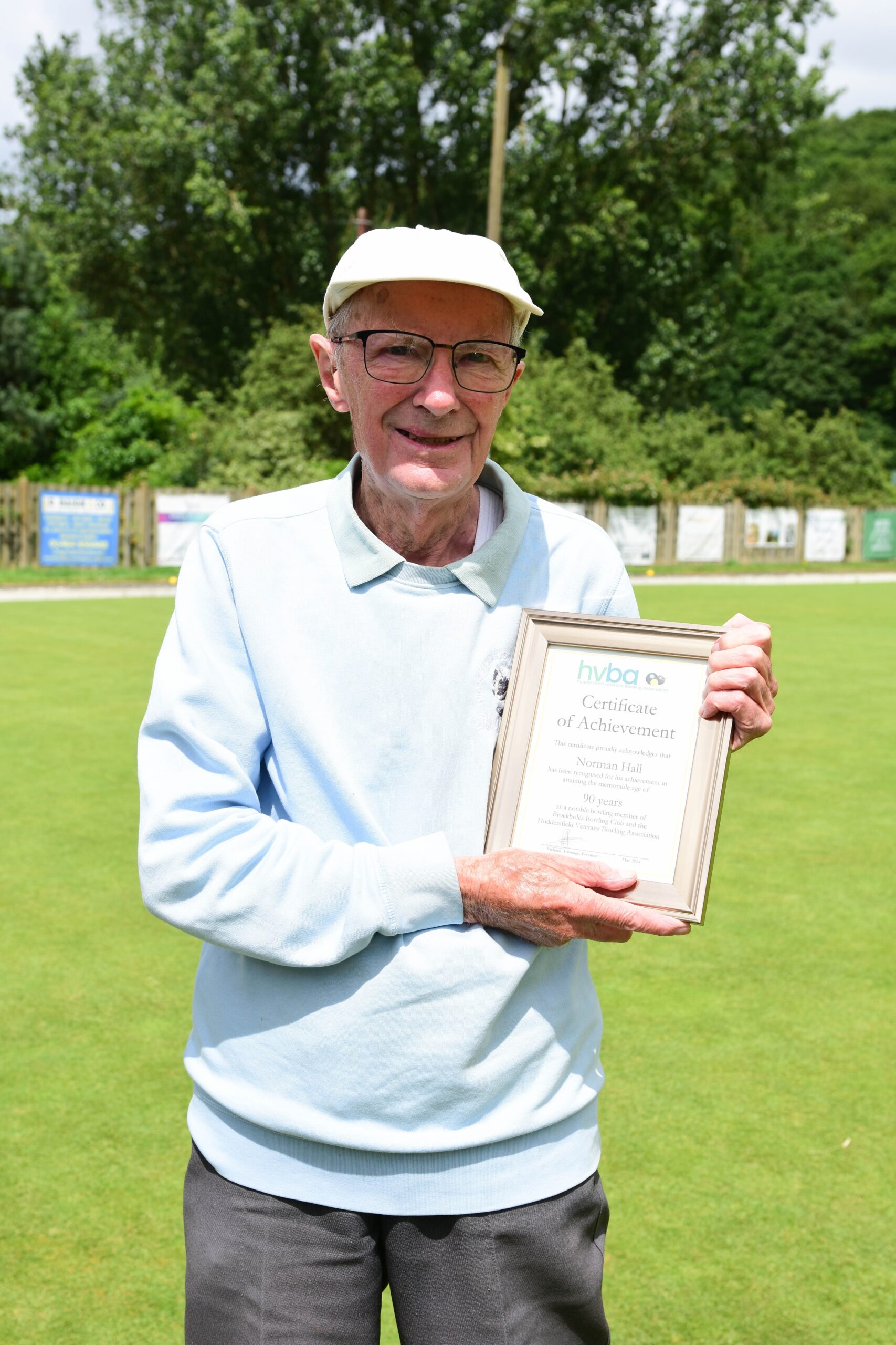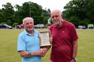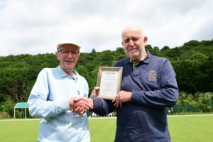 The second bowler to be presented was Norman Hall of Brockholes Bowling Club who turned 90 on 18 May. Normans teammates had gathered before the 10-man team match with Huddersfield RUBC but Norman was blissfully unaware and had to be coaxed out of the club to be confronted by photographer Paul English and myself for the presentation. On researching his records on Bowlsnet I was aware of his prowess as a bowler but his records only went back to 2021 and with a ST prefix to his BCGBA number. He explained that he had only recently moved to this area from Staffordshire, their loss and Brockholes’ gain.