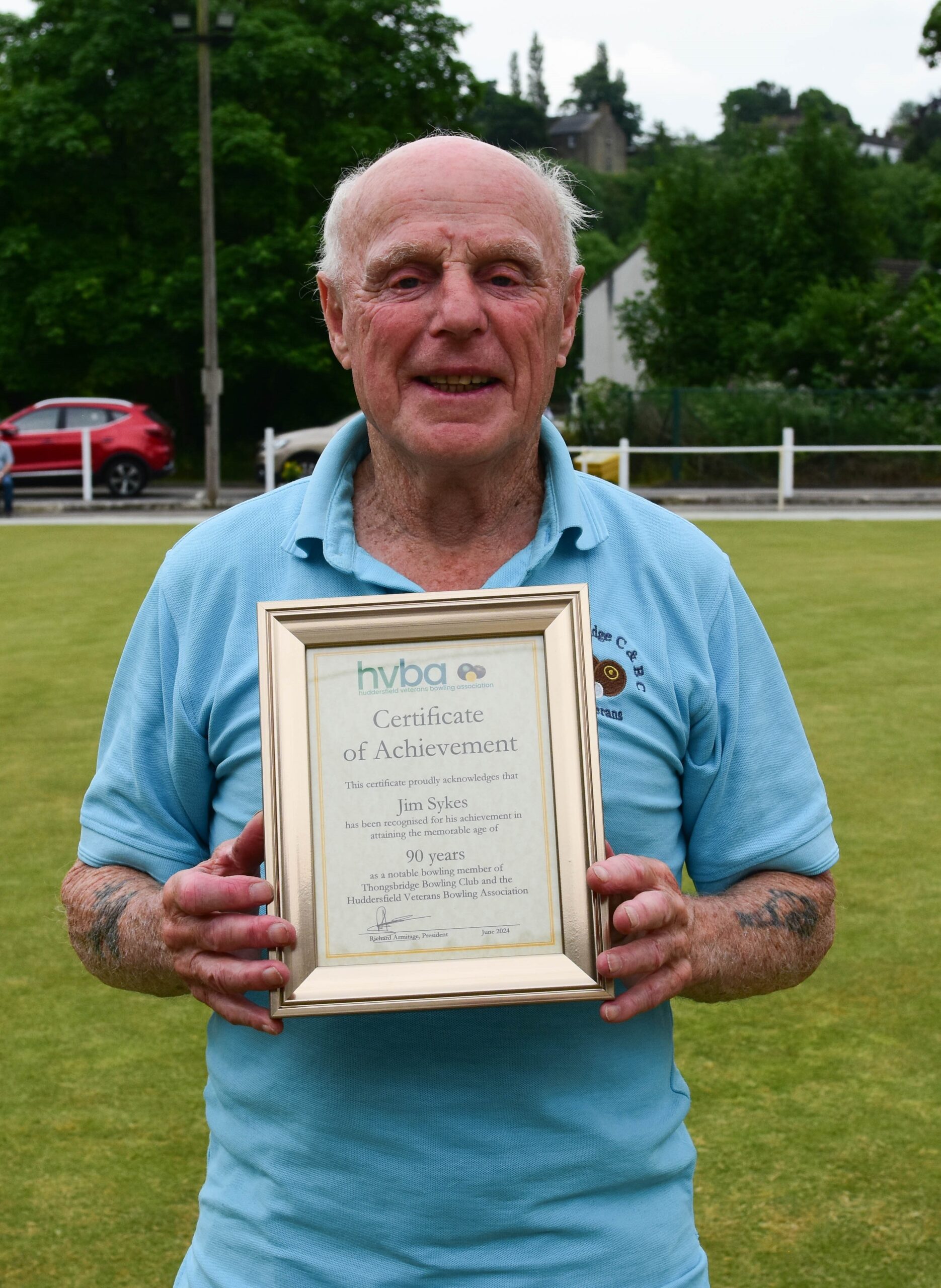 My first ‘victim’ (I feel very much like Eamon Andrews turning up for This is Your Life) was Jim Sykes, my Thongsbridge teammate who several months ago asked for no fuss for his birthday. Jim was 90 on 16 June and his teammates gave him a card and Jim turned up with a birthday cake for all the bowlers there that unfortunately I missed! I’ve known Jim for probably 25 years and know that he’s fiercely competitive and is still striving to be a better bowler.